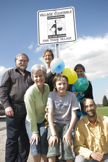 Fair trade advocates got to inaugurate a brand new sign sporting Wakfield's "Fair Trade Village" status. Clockwise from left: La Pêche Mayor Robert Bussière, Anne Winship, Alise Marlane, Jay Sinha, Angus Winship and Wakefield Councillor Lynn Berthiaume pose with the sign on Valley Drive.